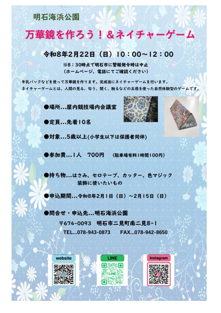 詳しくは、魚住北公園(078-947-4050)または明石海浜公園(078-943-0873)までお問い合わせください。