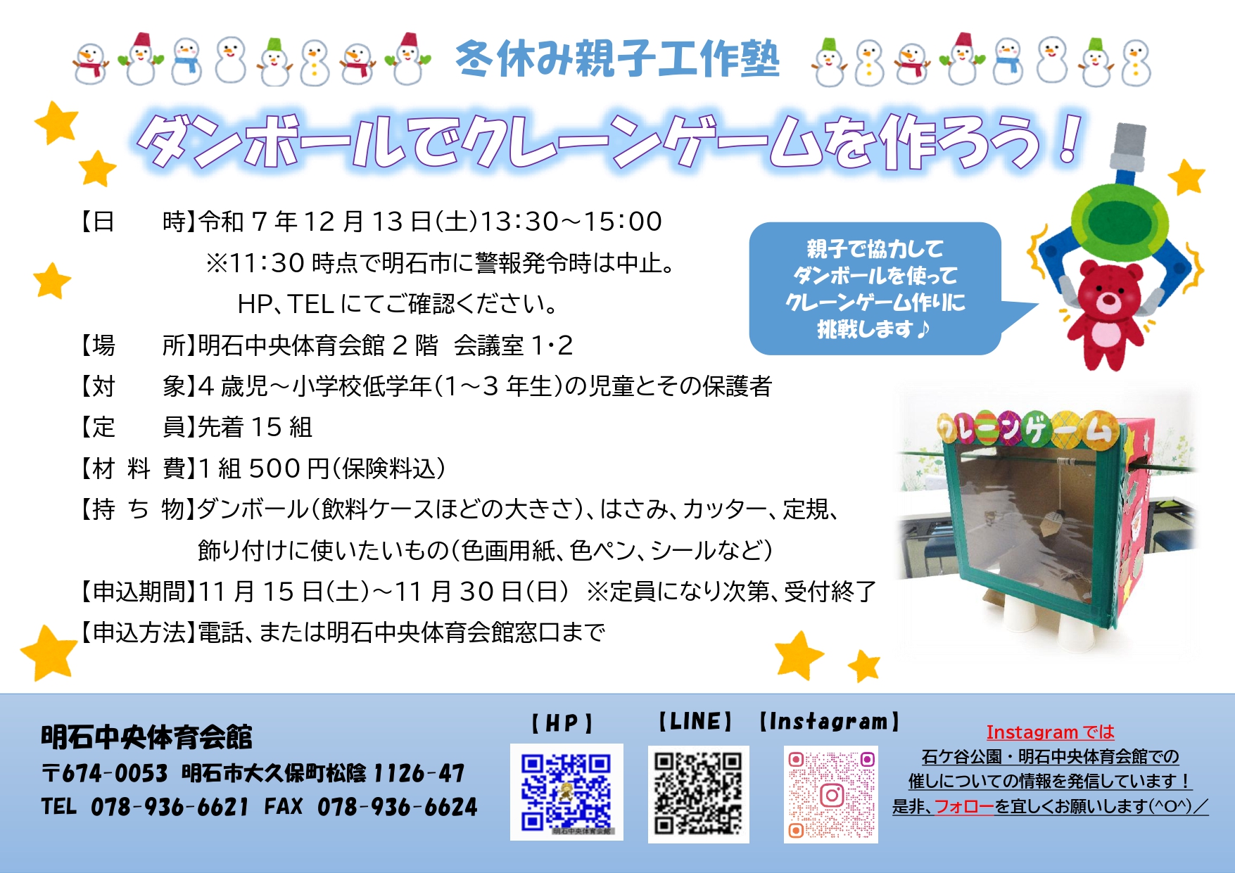 令和7年12月13日(土)冬休み親子工作塾「ダンボールでクレーンゲームを作ろう!」
